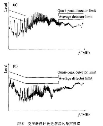 圖5為變壓器設(shè)計(jì)改進(jìn)前后實(shí)驗(yàn)樣品的傳導(dǎo)噪聲頻譜對(duì)比。