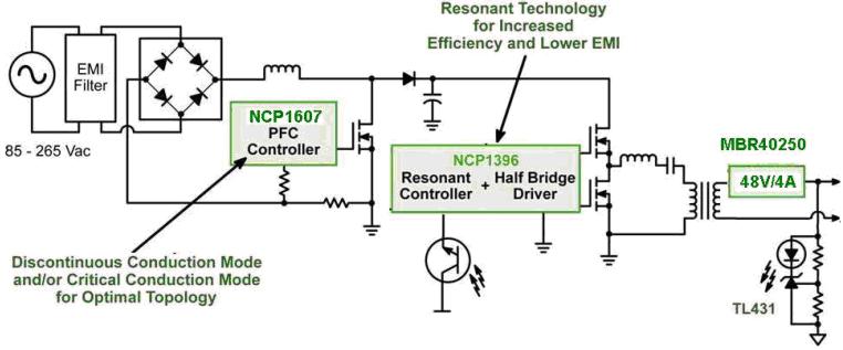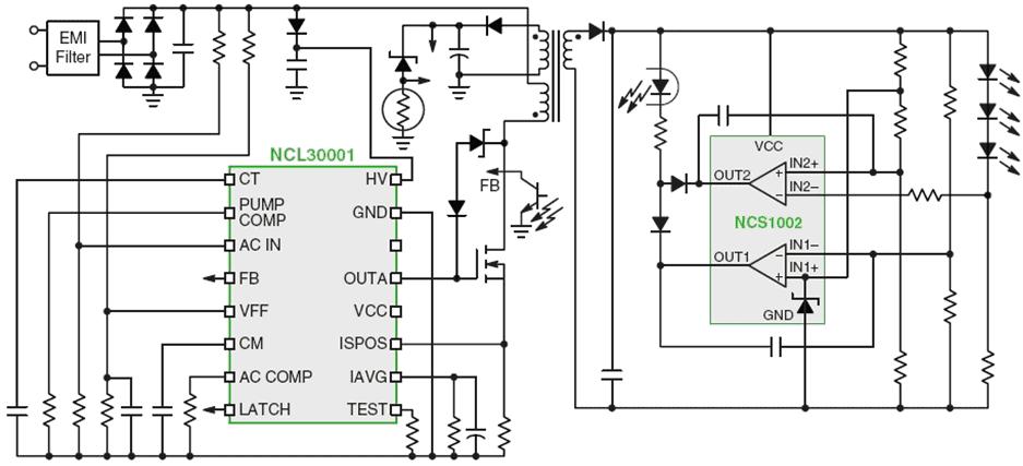 NCL30001是一種整體式/單段式的LED驅動方案,這種方案集成了PFC和隔離型DC-DC轉換電路,并提供恒定電流來直接驅動LED。這種方案相當于將AC-DC轉換與LED驅動兩部分電路整合在一起,均位于照明燈具內,省下了LED光條中集成的線性或DC-DC轉換器。這種整體式方案的電源轉換段更少,減少元器件使用數(shù)量(如光學元件、LED、電子元件及印制電路板等)、降低系統(tǒng)成本,并支持更高的LED電源總體能效。當然,這種方案的功率密度更高,可能并不適合所有區(qū)域照明應用,其光學圖案可能更適合較低功率的LED,典型應用包括LED街燈、外墻燈、洗墻燈及電冰箱箱體照明等。