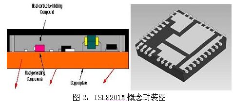 Intersil的ISL8201M模塊集成了一個(gè)完整的DC/DC轉(zhuǎn)換器所需的大多數(shù)組件,包括PWM控制器、MOSFET和電感器。其輸入電壓范圍為3-20V,電流能力為10A。它可實(shí)現(xiàn)比傳統(tǒng) SIP DC/DC模塊高得多的開關(guān)頻率,通過不使用MOSFET封裝并將這些組件共同封裝在一個(gè)緊湊的15×15×3.5mm的QFN封裝中(見圖2),實(shí)現(xiàn)了極佳的效率和熱性能。ISL8201M是一個(gè)系列模塊中的第一個(gè)產(chǎn)品,尺寸和性能的進(jìn)一步改善正在開發(fā)當(dāng)中。