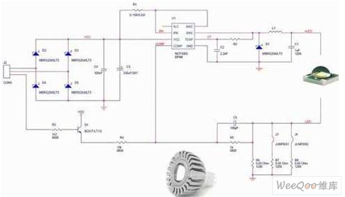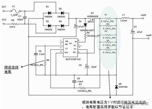 圖3:采用峰值電流控制的NCP1216非隔離型離線式LED驅(qū)動應(yīng)用。