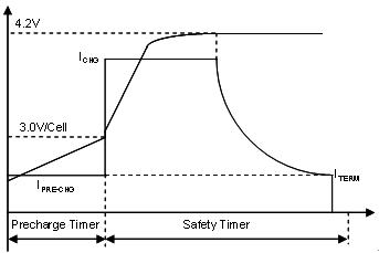 預(yù)充電安全定時器可避免長時間給電量耗盡的電池充電。一般說來,電池單元電壓達到 3.0 V,充電器就會進入 CC 階段??焖俪潆婋娏魍ǔO薅ㄔ?0.5 至 1C 之間,以避免過熱導(dǎo)致電池加速退化。應(yīng)選擇適當?shù)乃俣?,確保電池溫度不超過 45oC,然后在快充速率下進行電池充電,直至電壓達到調(diào)節(jié)限度(對基于 LiCoO2 的陰極而言通常是每單元 4.2 V)。充電器開始調(diào)節(jié)電池電壓并進入 CV 階段,這時充電電流會呈指數(shù)地下降至預(yù)定終止水平,結(jié)束電池充電。