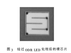 本批實(shí)驗(yàn)樣品采用揚(yáng)州華夏集成光電有限公司生產(chǎn)的芯片.對(duì)一塊外延片整體進(jìn)行測(cè)試,發(fā)現(xiàn)測(cè)試結(jié)果基本一致后試制成芯片. 將該外延片一半制做成普通LED 芯片,另一半制做ODR LED 芯片,芯片的尺寸為40 mil. 選取一個(gè)單元中的ODR LED芯片如圖3 所示,與圖2 比較,可以明顯看出芯片亮度不同.