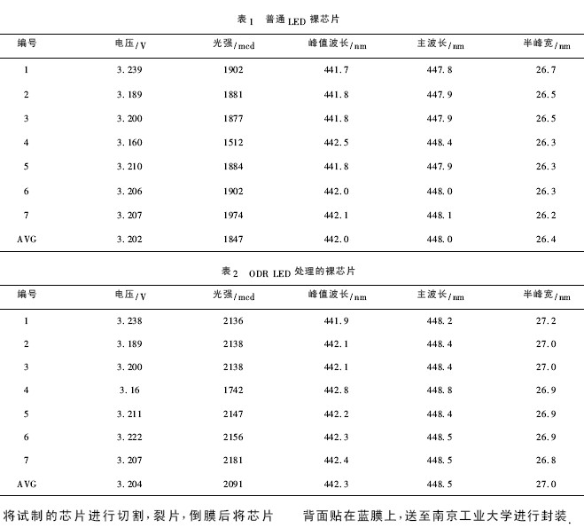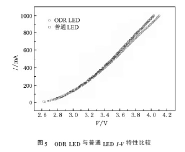 由兩種LED 曲線的解析( 4) ,( 5) 式也可以看出兩種LED 的電壓差差距較小,說明ODR LED 處理對(duì)LED 器件電壓基本無影響.