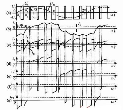 A、B兩點之間電壓分別為,UAB=UA-UB,UAB''=UA''-UB'',可以看出,原來處于死區(qū)時間內(nèi)電壓為0的區(qū)域在續(xù)流的作用下變得有電壓了。電壓的大小由電流的方向決定,當(dāng)i>0時,VD2、VD3續(xù)流形成回路,輸出電壓UO=UA-UB為-Ed;當(dāng)i<0時,VD1、VD4續(xù)流形成回路,輸出電壓UO=UA-UB為+Ed。
