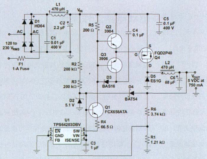 FQD2P40相對較新,即400V P通道MOSFET。利用10V柵極驅(qū)動的5.0Ω RDS(on) 以及小于13nC的總選通電極充電,借助于由Q2、Q3、C4和D3組成的創(chuàng)新驅(qū)動電路,該FET可輕松地通過控制器開關(guān)擁有比老式FET相對更少的導電和開關(guān)損耗。我們選擇轉(zhuǎn)換器的整流肖特基二極管D5,因為它擁有可阻止輸入電壓的電壓額定值、稍高于輸出電壓的峰值電流額定值,以及IDiode(Avg) =(1 – D) × IOUT(max)的平均電流額定值。利用Dmax 5 V/120 V = 0.04 以及如此低的輸出功率,峰值電流額定值和功耗在兩種開關(guān)中都不成問題。