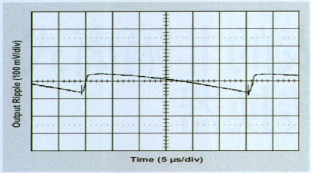 相對較高的K值最小化了電感值,并且經(jīng)證明是可以接受的,因為這種特殊應用的穩(wěn)態(tài)輸出紋波要求小于0.02 × VOUT,即高負載時的100mVPP。磁滯后,TPS6420x控制器一般在輸出電壓有一些紋波時工作效果最佳,建議使用至少 50mΩ ESR的輸出電容可產(chǎn)生ΔVPP(ESR) = ΔIL × RESR的紋波電壓,其一般遠超出電壓紋波的電容分量。圖2顯示了該應用測得紋波。