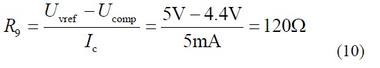 式中Uvref 為芯片8 腳電壓5V, U comp 為芯片1 腳電壓,計(jì)算時取系統(tǒng)穩(wěn)定時1 腳電壓最大值。