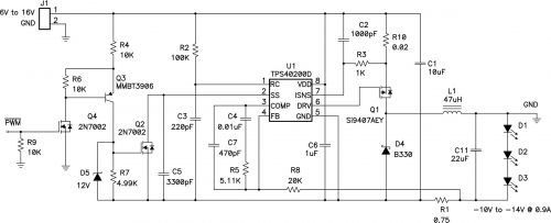 這種反相升降壓電路為工程師提供了另一種驅(qū)動 LED的方法。低成本降壓控制器的使用以及較少的元件數(shù)量使其成為替代高復(fù)雜度拓樸的一種理想方法。