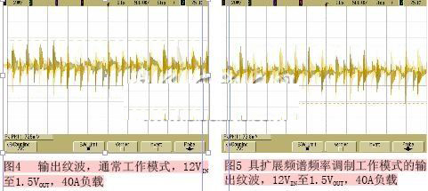 令人驚奇的是,對該系統(tǒng)進一步的分析表明,在使用擴展頻譜頻率調制時,輸出紋波沒有受到非常大的影響。有和沒有擴展頻譜頻率調制的性能比較如圖4和圖5所示。比較兩圖中的峰峰值,觀察到的變化是很小的。如果仍不信服,可進行另一個測試-負載瞬態(tài)響應測試,以進一步確證。