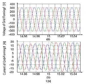 第一個電網(wǎng)形成方式的逆變器在連接點處的電壓和電流如圖9所示。逆變器電壓幾乎不受干擾,與此同時,只有電流去適應(yīng)相關(guān)負(fù)載情況。