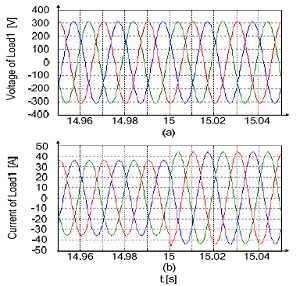 圖10 (a) t=15s時加入階躍負(fù)載的負(fù)載三相電壓 (b) t=15s時加入階躍負(fù)載的負(fù)載三相電流