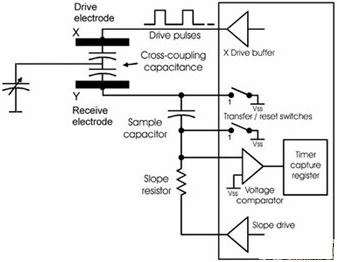 RC時(shí)間常數(shù)技術(shù)的基本原理是,當(dāng)電容組件C隨手指觸摸改變時(shí),電極區(qū)域充電或放電所需的時(shí)間也隨之改變。測量充/放電期間的變化可得到C的變化,因?yàn)镃是未知,所以假設(shè)為Cx,這種方法有許多變化形式,可測量頻率或時(shí)間、可自由運(yùn)行或以單周期為基礎(chǔ)。RC時(shí)間常數(shù)測量的缺點(diǎn)是速度較慢,并易受泄漏電流干擾,其動態(tài)范圍也非常有限,很難校準(zhǔn),而且容易受到恒定漂移問題的影響。此外,由于其電路的高阻抗特性,所以也極易受外界噪聲干擾,盡管如此,仍有部分觸控屏幕采用這種方案。