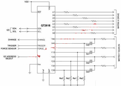 透過連接一個(gè)放在六電極Y層上的八電極X層,控制器可支持大至8寸的雙觸控屏幕,而且這種多功能控制器能感測多達(dá)六個(gè)滑塊或四十八個(gè)離散式按鍵,或按鍵、滑塊與觸摸區(qū)域的組合,該控制器為接腳數(shù)精簡的版本,利用類似的簡單布線圖(圖8),能夠驅(qū)動八條X軸和接收四條Y軸,或區(qū)分多達(dá)三十二個(gè)離散式按鍵。