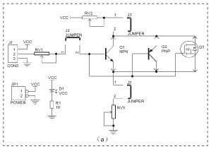我們制作了晶體管的測試電路板,分別對NPN 型晶體管2N5551、PNP 型晶體管2N5401 驅(qū)動電路中相同負(fù)載的不同接法做了實物測試。圖4(a)是晶體管測試電路板的原理圖,將圖4(a)左邊J1 的1、2 引腳短接,可以測試NPN 型晶體管負(fù)載驅(qū)動電路;將J1的2、3引腳短接,可以測試PNP型晶體管負(fù)載驅(qū)動電路。
