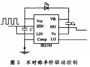 不對(duì)稱(chēng)半橋驅(qū)動(dòng)電路,如圖3所示。驅(qū)動(dòng)集成芯片采用IR公司的IR2103,其輸出級(jí)作為推挽驅(qū)動(dòng)輸出,以直接耦合的方式與主電路的開(kāi)關(guān)管相連接,由HO和LO的輸出分別作為驅(qū)動(dòng)橋式電路的上、下橋臂。為了實(shí)現(xiàn)上橋臂驅(qū)動(dòng)電路的地電位與主電路的同步浮動(dòng),采用由DB和CB組成的外接自舉電路。