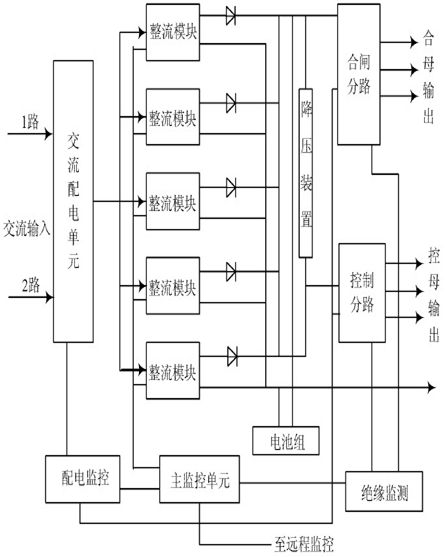 智能高頻開關(guān)電源系統(tǒng)的總體結(jié)構(gòu)主要由主監(jiān)控單元、配電模塊、交流配電單元、整流模塊等組成, 系統(tǒng)總體的結(jié)構(gòu)圖如圖1 所示。系統(tǒng)中的各個(gè)監(jiān)控單元受主監(jiān)控單元的管理和控制, 通過(guò)通信線將各個(gè)監(jiān)控單元采集的信息送給主監(jiān)控統(tǒng)一管理。主監(jiān)控顯示直流系統(tǒng)各種信息, 用戶也可以觸摸顯示屏查詢信息及操作,系統(tǒng)信息還可以接入到遠(yuǎn)程監(jiān)控系統(tǒng)中。系統(tǒng)除了交流監(jiān)控、直流監(jiān)控、開關(guān)量監(jiān)控等基礎(chǔ)單位外, 還配置了絕緣監(jiān)測(cè)、降壓裝置、電池巡檢等功能單元, 以達(dá)到對(duì)直流系統(tǒng)進(jìn)行全面監(jiān)控的目的。