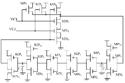 本文所設(shè)計的主振蕩器采用如圖2 所示的環(huán)形振蕩器結(jié)構(gòu)。VC1, VC2 分別為過壓保護電路, PWM 比較器的輸出信號, MP10和MP11 為帶隙基準(zhǔn)提供的鏡像電流, 合理的控制鏡像電流和電容C1 , C2 的大小, 即能夠使主振蕩器在1. 9~ 8 V 的V DD區(qū)間輸出350 kHz 左右較穩(wěn)定的振蕩頻率。