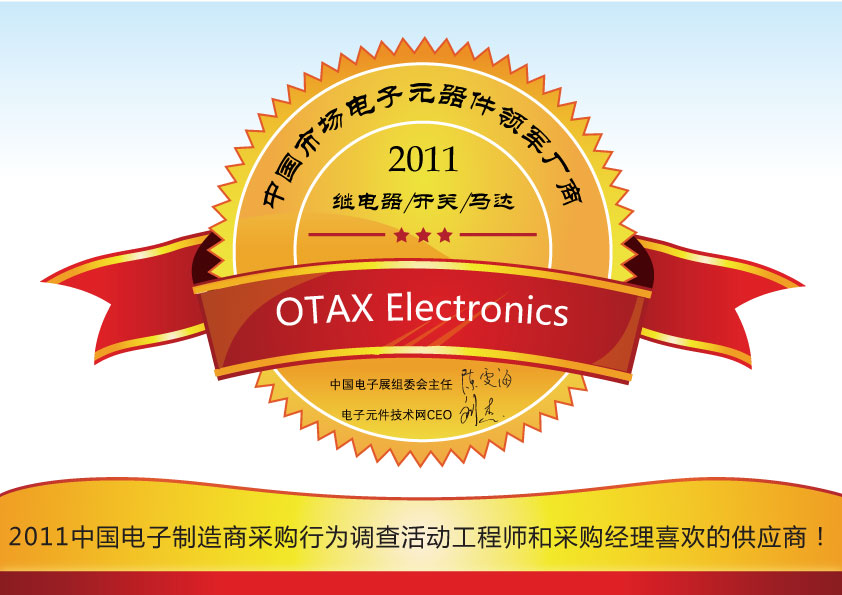 在近日剛剛結(jié)束的2011中國電子制造商采購行為調(diào)查暨中國市場電子元器件領(lǐng)軍廠商的評選活動中,OTAX Electronics憑借持續(xù)穩(wěn)定的產(chǎn)品、技術(shù)和服務(wù)等多方面優(yōu)勢,以及在工程師心目中形成的良好形象,一舉榮獲2011中國市場電子元器件(繼電器/開關(guān)/馬達類)領(lǐng)軍廠商稱號!