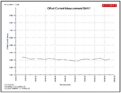 確定了安培計(jì)的偏移電流后,將系統(tǒng)的其余部分逐步添加至測(cè)試電路,通過重復(fù)電流(0V)和時(shí)間圖,驗(yàn)證系統(tǒng)其余部分的偏移(利用圖3中所示的“Append Run”按鈕)。最后,在“up”位置對(duì)探針末端或未連接器件的測(cè)試夾具進(jìn)行測(cè)量。該過程將有助于確定任何故障點(diǎn),例如短路的電纜或測(cè)量電路中的不穩(wěn)定性。然而,要意識(shí)到,連接和斷開電纜都會(huì)在電路中產(chǎn)生電流。為了進(jìn)行超低電流測(cè)量,可能有必要在改變測(cè)試電路的連接后等待幾分鐘至幾個(gè)小時(shí),使雜散電流衰減。圖4中的圖形顯示的是以下條件下的偏移:1)SMU的Force HI端子上戴有金屬帽;2)前置放大器上僅連接一根三軸電纜;3)通過吉時(shí)利7174A型小電流開關(guān)矩陣至探針臺(tái),“up”位置有一個(gè)探針。
