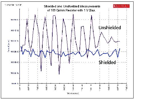 為了減小靜電場(chǎng)影響,被測(cè)電路可被密封在一個(gè)靜電屏內(nèi)。圖8所示為非屏蔽和屏蔽測(cè)量一個(gè)100GΩ電阻之間的巨大差異。非屏蔽測(cè)量比屏蔽測(cè)量時(shí)的噪聲要大得多。