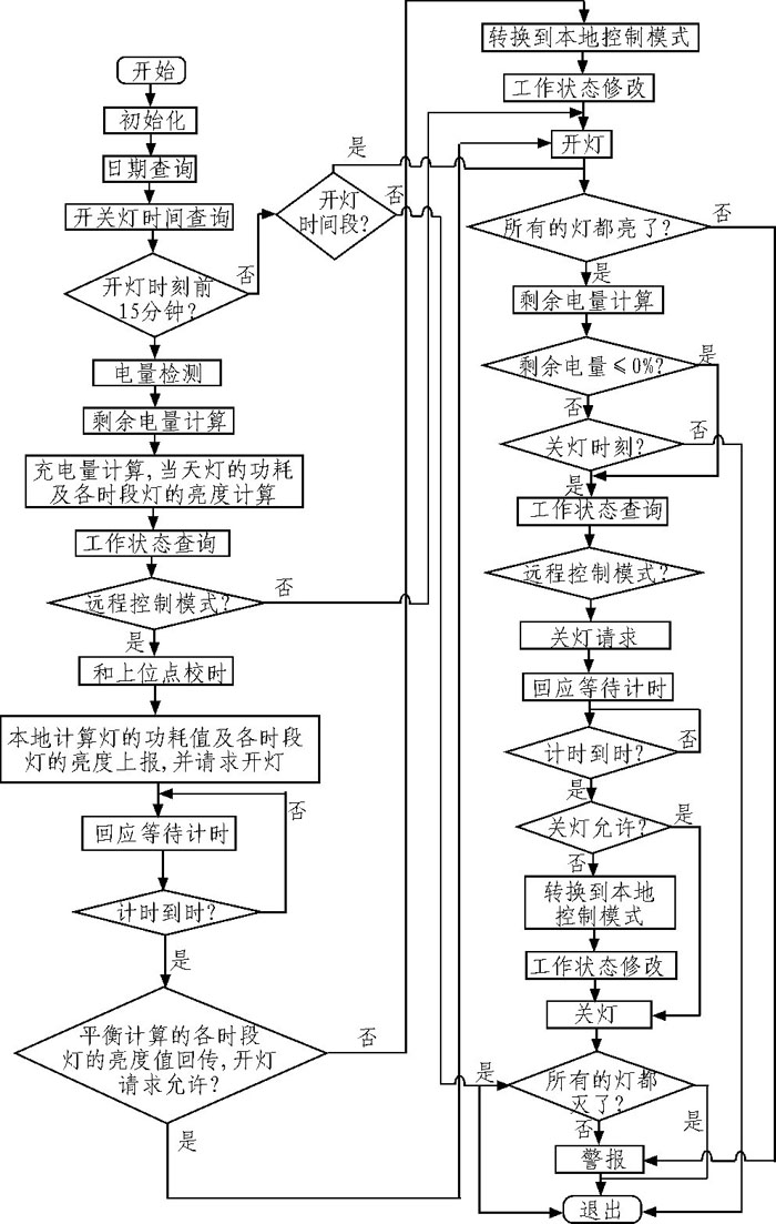 進(jìn)行太陽(yáng)能路燈電池板電流檢測(cè),蓄電池電壓檢測(cè),蓄電池電量監(jiān)測(cè),以及環(huán)境溫度的檢測(cè),采用光開時(shí)關(guān),并實(shí)時(shí)上傳工作環(huán)境及狀態(tài)數(shù)據(jù),預(yù)警故障,保證系統(tǒng)的可靠性。圖2為太陽(yáng)能路燈的開、關(guān)控制流程網(wǎng)。
