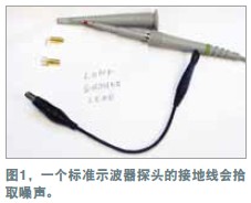 在測量電源軌的紋波時,必須盡量減小噪聲,因為紋波幅度可能很小。示波器探頭是基本的測量工具,但它們可能引入噪聲與誤差。地線(如與標準示波器探頭連接的那根線)可能增加一些不會出現(xiàn)在示波器軌跡上的電路噪聲。線路環(huán)就像一根天線,會提取周圍的雜散磁場。環(huán)路面積越大,提取的噪聲就越多。為證明這個理論,可將示波器地線連接到探頭尖端,然后到處移動。示波器會隨著地線的移動而顯示出噪聲的增減。用一個示波器探頭及其地線和插座可以做一個簡單的連接板(圖1)。