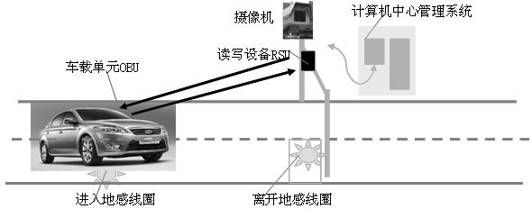 OBU 中存有車輛的識別信息,如車牌號、汽車ID號,一般安裝于車輛前面的擋風(fēng)玻璃上,RSU安裝于收費站旁邊,環(huán)路感應(yīng)器安裝于車道地面下。中心管理系統(tǒng)有大型的數(shù)據(jù)庫,存儲大量注冊車輛和用戶的信息。當(dāng)車輛通過收費站口時,環(huán)路感應(yīng)器感知車輛,路邊單元發(fā)出詢問信號,車載單元做出響應(yīng)。并進行雙向通信和數(shù)據(jù)交換,中心管理系統(tǒng)獲取車輛識別、車型等信息并和數(shù)據(jù)庫中相應(yīng)信息進行比較判斷,根據(jù)不同情況來控制管理系統(tǒng)產(chǎn)生不同的動作。通過路邊單元與車載單元進行相互通信和信息交換,以達到對車輛的自動識別,并自動從該用戶的專用帳戶中扣除通行費,從而實現(xiàn)自動收費。