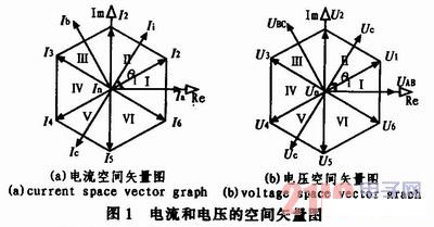 矩陣變換器應用雙空間矢量調制法(SVM)時可以等效為一個虛擬的整流器和一個虛擬的逆變器,它們的6個有效的空間矢量分別如圖1所示,對輸入電流和輸出電壓分別進行嵌套。從而有36種可能的扇區(qū)組合。