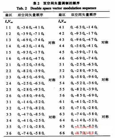 空間矢量調制法只確定開關間隔中應用電壓矢量的占空比,從而獲得低頻率的輸出電壓和輸入電流的平均值,但是并沒有確定使用的順序。所以需要使用雙空間矢量調制法,同時也可改善波形的質量。圖2表明了輸入電流在4扇區(qū),輸出電壓在5扇區(qū)應用雙空間矢量調制的順序。電壓矢量在開關間隔中對稱分布,零矢量每4個開關間隔使用一次。在每次開關轉換中只有一個開關狀態(tài)發(fā)生改變以最大程度地降低損耗。在圖2中通過表格2確定相應開關時間: