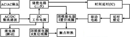 斷電延時繼電器整體構成包括斷電延時繼電器電源部分(經(jīng)降壓、整流、濾波)以提供斷電延時繼電器內置瞬動電磁繼電器和2繞組閉鎖型R復位線圈工作);二次電源部分(供斷電后延時部分與2繞組閉鎖型S置位線圈工作);延時工作部分(可編程定時集成或CMOS計數(shù)分頻集成);驅動部分;執(zhí)行繼電器部分組成(圖1)。