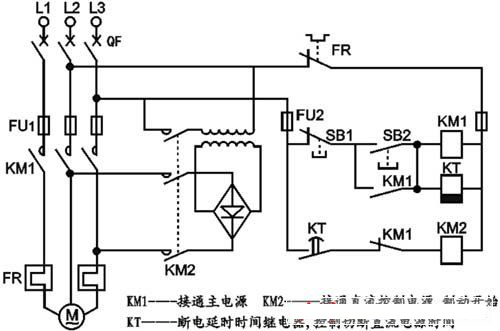 制動過程:按下停止按鈕SB1→KM1斷電,KM1主觸點斷開,電機脫離電源,KM1輔助常閉觸點恢復閉合,KM2通電,接入直流電源,制動開始,同時KM1輔助常開觸點又恢復斷開,則KT線圈呈斷電狀態(tài),延時開始,待所設延時時間到達后,KT的延時斷開常開觸點恢復斷開,KM2失電,切斷直流電源,制動結束。