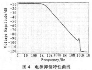 圖4是在1 Hz到10 GHz的范圍進(jìn)行掃描所得到的不同的電源抑制情況。低頻時抑制情況不太好,在-10 dB左右,還有待于提高;高頻抑制情況很好,基本穩(wěn)定在-120 dB左右。與傳統(tǒng)電路相比,本文提出的這種電路可以用于在各種系統(tǒng)尤其是高頻系統(tǒng)中,這一點是傳統(tǒng)電路所無法比擬的。