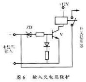 輸出電壓低于規(guī)定值時,反映了輸入直流電源、開關穩(wěn)壓器內部或者輸出負載發(fā)生了異常。輸入直流電源電壓下降到規(guī)定值之下時,會導致開關穩(wěn)壓器的輸出電壓跌落,輸入電流增大,既危及開關三極管,也危及輸入電源。因此,要設欠電壓保護。簡單的欠電壓保護如圖6所示。