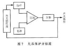 當未穩(wěn)壓輸入的電壓值正常時,穩(wěn)壓管ZD擊穿,晶體管V導通,繼電器動作,觸點吸合,開關穩(wěn)壓器加電。當輸入低于所允許的最低電壓值時,穩(wěn)壓管ZD不通,V截止,觸點跳開,開關穩(wěn)壓器不能工作。開關穩(wěn)壓器內部,由于控制電路失?;蛘唛_關三極管失效會使輸出電壓下降;負載發(fā)生短路也會使輸出電壓下降。特別在升壓型或反相升壓型的直流開關穩(wěn)壓器中欠電壓的保護是跟過電流保護緊密相關的,因而更加重要。實現(xiàn)方法是在開關穩(wěn)壓器的輸出端接電壓比較器,如圖7所示。