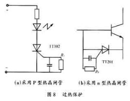 采用溫度繼電器來檢測電源裝置內部的溫度,當電源裝置內部產(chǎn)生過熱時,溫度繼電器就動作,使整機告警電路處于告警狀態(tài),實現(xiàn)對電源的過熱保護。亦可將溫度繼電器置于開關三極管的附近,一般大功率管允許的最高管殼溫度是75℃,調節(jié)溫度整定值為60℃。當管殼溫度超過允許值后繼電器就切斷電器,對開關管進行保護。半導體熱敏開關器件“熱晶閘管”在超溫保護方面有重要作用。它可以用作溫度指示電路。根據(jù)p型控制柵熱晶閘管(TT102)的特性,由RT值確定該器件的導通溫度,RT越大,導通溫度越低。當將其放置功率開關三極管附近,或在電源裝置內時,它就能起到溫度指示作用。當功率管的管殼溫度或者裝置內部的溫度超過允許值時,熱晶閘管就導通,使發(fā)光二極管發(fā)亮告警。倘若配合光電耦合器,就可使整機告警電路動作,保護開關穩(wěn)壓器。它亦可以象圖8(b)那樣用作功率晶體管的過熱保護,晶體開關管的基極電流被n控制柵型熱晶閘管TT201旁路,開關管截止,切斷集電極電流,防止過熱。
