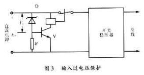開關穩(wěn)壓器的過電壓保護包括輸入過電壓保護和輸出過電壓保護。開關穩(wěn)壓器所使用的未穩(wěn)壓直流電源諸如蓄電池和整流器的電壓如果過高,使開關穩(wěn)壓器不能正常工作,甚至損壞內部器件,因此,有必要使用輸入過電壓保護電路。用晶體管和繼電器組成的過電壓保護電路如圖3所示。