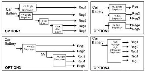 這里列出了四種常用的電源架構(gòu),總結(jié)了最近三年汽車領(lǐng)域的典型設(shè)計(jì)架構(gòu)。當(dāng)然,用戶可以通過(guò)不同方式實(shí)現(xiàn)具體的設(shè)計(jì)要求,多數(shù)方案可歸納為這四種結(jié)構(gòu)中的一種。