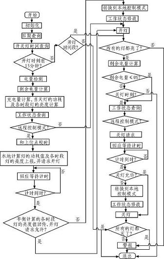 進(jìn)行太陽能路燈電池板電流檢測(cè),蓄電池電壓檢測(cè),蓄電池電量監(jiān)測(cè),以及環(huán)境溫度的檢測(cè),采用光開時(shí)關(guān),并實(shí)時(shí)上傳工作環(huán)境及狀態(tài)數(shù)據(jù),預(yù)警故障,保證系統(tǒng)的可靠性。圖2為太陽能路燈的開、關(guān)控制流程網(wǎng)。