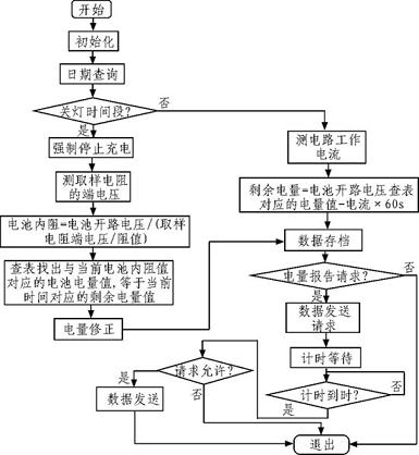 通過計(jì)算電流在時(shí)域上的積分,可得出電量變化值,在路燈工作前檢測(cè)到的電池電量作為初始電量,則剩余電量為初始電量減去電量變化值。同時(shí)通過對(duì)MPPT電路的輸出電流做積分,作為電量變化的校正值,從而得到較準(zhǔn)確的剩余電量值。圖5為剩余電量計(jì)算流程圖。