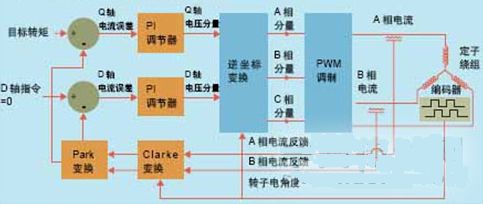 從控制原理上講,磁場定向控制方法的電流環(huán)運(yùn)行是獨(dú)立于電機(jī)旋轉(zhuǎn)的。在FOC方法中存在兩個實(shí)際的電流環(huán),一個用于Q軸轉(zhuǎn)矩,另一個用于D軸轉(zhuǎn)矩。Q軸轉(zhuǎn)矩電流環(huán)施以來自伺服控制器的用戶目標(biāo)轉(zhuǎn)矩,D軸電流環(huán)則施以零輸進(jìn)指令,以便使不想要的直軸分量降至最低。