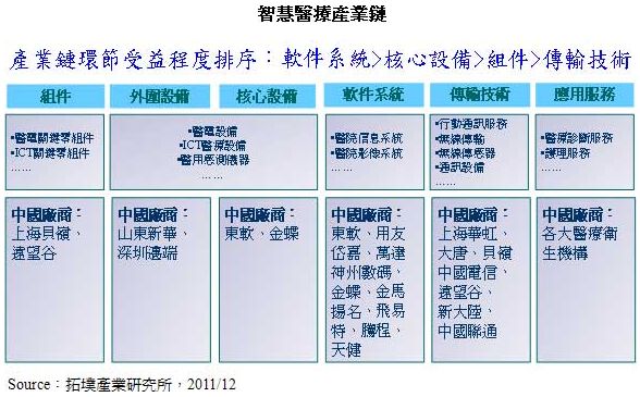 除智能電網(wǎng)之外,蘊(yùn)藏1,200億元人民幣商機(jī)的智能醫(yī)療產(chǎn)業(yè),也是臺(tái)廠切入大陸物聯(lián)網(wǎng)市場(chǎng)另一個(gè)機(jī)會(huì)點(diǎn)。大陸“新醫(yī)改”將配合“健康中國(guó)2020”發(fā)展目標(biāo),以政策為導(dǎo)向推動(dòng)改革規(guī)劃,十二五期間將投入8,500億元人民幣,循此戰(zhàn)略規(guī)劃全面提升中國(guó)大陸醫(yī)療水準(zhǔn)。