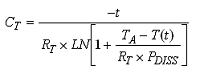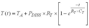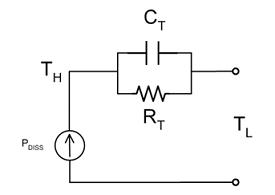 該模擬可以深入進(jìn)行,以描述器件的另一個(gè)熱屬性,稱(chēng)之為熱容。正如將熱阻模擬為電阻,可以將熱容(CT,單位為J/℃)模擬為電容。將熱容與熱阻并聯(lián)獲得熱阻抗(ZT)。圖1所示為傳導(dǎo)傳熱的簡(jiǎn)化RC模型。能源被模型化為電流源,熱阻抗被模型化為CT與RT并聯(lián)。