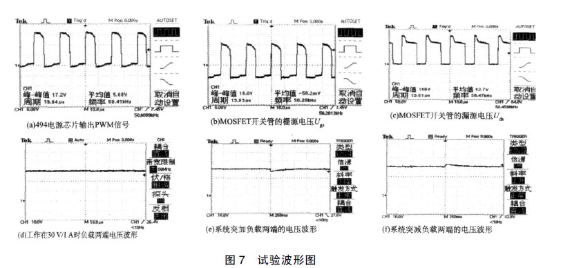 通過調(diào)壓器在供電電源端輸入110 V 的交流電壓, 使得系統(tǒng)穩(wěn)定的工作在30 V、1 A 的負(fù)載下, 觀察TL494 電源芯片輸出的驅(qū)動信號波形、MOSFET 開關(guān)管Ugs、Uds 、負(fù)載正常工作時的波形、以及突然加載、突然掉載情況, 其試驗波形如圖7。