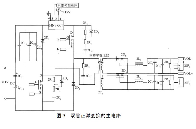 從圖3 可以看出, 電路結(jié)構(gòu)簡單, 容易實現(xiàn), 并在MOSFET 橋臂增加了霍爾傳感器, 以保證輸出反饋電流環(huán)的要求。為了增加電路的通用性, 設(shè)計的電路板增加了雙路輸出的功能, 只要改變變壓器的設(shè)計, 即可以完成多路輸出。當(dāng)兩個主功率開關(guān)管截止時, 原邊繞組的電壓極性相反, 使另外一橋臂的兩個二極管導(dǎo)通, 電壓被箝位在輸入電壓值。因此開關(guān)管承受的電壓與輸入電壓相同。在輸入電壓最大值低于350 V時, 開關(guān)管只需要選擇450 V 的耐壓值即可。這里我們選用N 溝道MOSFET , IRF830( 4. 5 A/ 500 V) 。