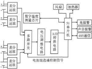 具有高電壓、高容量、循環(huán)壽命長、安全性能好等優(yōu)點的鋰離子電池,在便攜式電子設備、電動汽車、空間技術(shù)、國防工業(yè)等多方面具有廣闊的應用前景。由若干節(jié)鋰離子電池經(jīng)串聯(lián)組成的動力鋰離子電池組目前應用最為廣泛。由于每節(jié)單體電池的電壓不一致,使用中電池不允許過充電、過放電,電池的性能和壽命受溫度影響較大等特點,必須對串聯(lián)鋰離子電池組進行監(jiān)測,確保在使用中鋰離子電池具有良好的狀態(tài),或者使用中電池出現(xiàn)問題立即報警,電源管理系統(tǒng)立即采取保障措施,并提醒相關(guān)人員檢修。單體電壓和電池組的溫度是辨別串聯(lián)鋰離子電池組是否正常工作的主要技術(shù)指標。文獻[1]采用直接采樣法,將要測量的單體電池電壓存儲在非電容上進行測量。該方法反應時間慢、誤差較大、控制復雜;文獻[2]采用運放和光藕繼電器來測量串聯(lián)電池組的單體電壓。該方法對光耦的線性度要求很高,導致硬件成本較高。目前,直接采用集成芯片的串聯(lián)鋰離子電池組監(jiān)控系統(tǒng)受到青睞,但該方法串聯(lián)電池的數(shù)目固定,導致應用不靈活、硬件成本高等缺點。文中研制了一種動力鋰離子電池組監(jiān)測系統(tǒng),對串聯(lián)鋰離子電池組的單體電壓和電池組的溫度進行在線監(jiān)測,當單體電池電壓偏離規(guī)定區(qū)間時,監(jiān)測系統(tǒng)啟動報警程序進行聲、光報警;當電池組溫度偏離規(guī)定的區(qū)間時,監(jiān)測系統(tǒng)啟動風扇或加熱控制電路,并存儲有關(guān)數(shù)據(jù),確保電池組正常工作。整個監(jiān)測系統(tǒng)具有連續(xù)測量分量、簡單經(jīng)濟、精度高和可靠性高的特點。