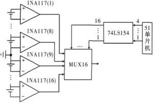 該檢測系統(tǒng)采用16個INA117分別把16節(jié)鋰離子電池的單體電壓挑選出來。如果它們的1腳都接相同的地,就可以使16個INA117都有相同的信號地,A/D轉(zhuǎn)換器進行采樣。共地點選在第8節(jié)電池負極和第9節(jié)電池正極的連接處。