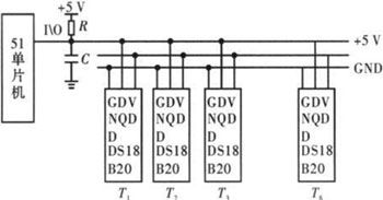 針對串聯(lián)電池組,傳統(tǒng)的測溫方法多采用模擬溫度傳感器進行測量,在數(shù)據(jù)的采集和傳輸過程中易受外界環(huán)境的干擾,從而使測得的結(jié)果誤差較大,且當測量點較多時,連線較復雜。文中采用單片機和單總線數(shù)字式溫度傳感器DS18B20來解決上述問題[5]。其原理如圖5所示。
