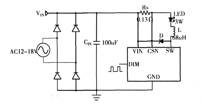 對于PT4115 (見圖4) 即可以應(yīng)用于12~18 V 的交流,也可應(yīng)用在8 V~30 V 的直流。因此,應(yīng)用范圍更加廣泛。并且,驅(qū)動電路簡單,所需元器件均價格低廉。適合批量、市場化。
