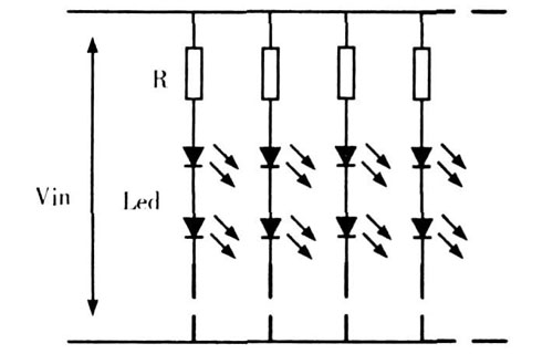 從圖2 中可見,采用電阻鎮(zhèn)流的驅(qū)動方式就是在LED 燈串上串聯(lián)上鎮(zhèn)流電阻。通過鎮(zhèn)流電阻降低在LED 燈串上的電壓,防止LED 過壓被擊穿。鎮(zhèn)流電阻的驅(qū)動方式實際上就是通常所說的恒壓驅(qū)動方式。該種驅(qū)動方式雖然簡單,但是在鎮(zhèn)流電阻上會有損耗,并且,損耗會隨輸入電壓的增大而增大。因此,該種技術(shù)作為最早的驅(qū)動技術(shù),已經(jīng)隨著技術(shù)的發(fā)展,逐漸被取代。