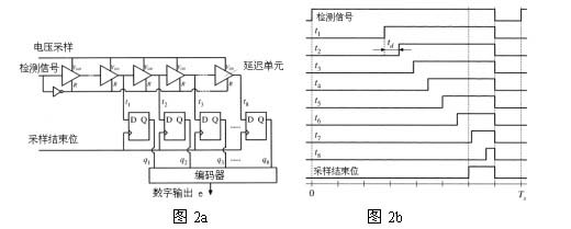 [page]控制處理器由高速A/D轉(zhuǎn)換器,數(shù)字PID補償器和數(shù)字DPWM輸出組成。外部存儲器記錄了控制處理器的相關程序。高速A/D轉(zhuǎn)換器是基于CMOS的傳輸延遲時間td 影響輸入電壓VDD的原理做成的,VDD電壓和傳輸時間是成近似的反比例關系,即VDD越大,信號傳輸延遲時間越小。如圖2所示,以CMOS的輸入電壓VDD作位采樣電壓的輸入口,各信號之間的傳輸時間延時td受采樣電壓VDD影響。第四分之三個采樣周期過后采樣結(jié)束位產(chǎn)生高電平,開始記錄q1到q8的輸出,把得到的結(jié)果送入編碼器得到數(shù)字輸出e,完成A/D轉(zhuǎn)換。如圖2b所示,數(shù)字采樣值為11111100.VDD越大,td越小得到的采樣值越大。